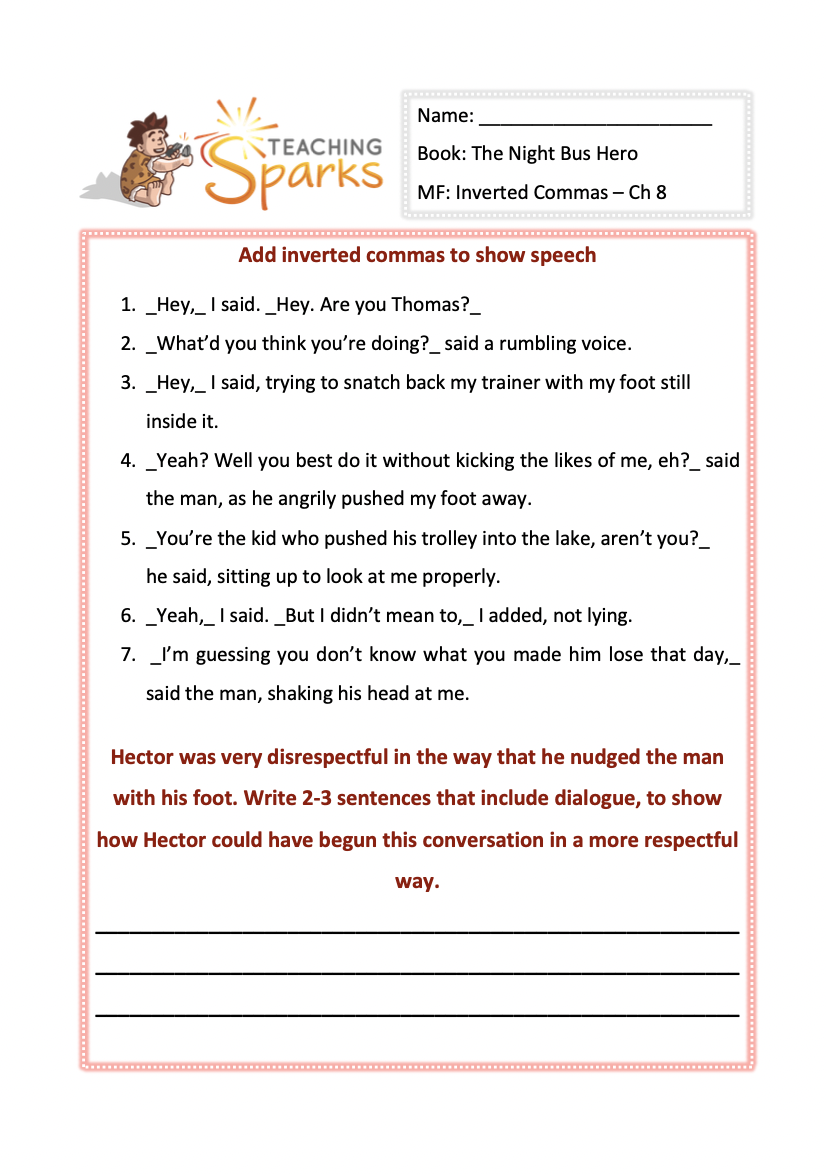 Inform your class that they need to read chapter 1 of ‘The Night Bus Hero’. Using the worksheets differentiated out in 5 different ways, your class will add the correct punctuation into the sentences. This resource focuses on capital letters, commas, exclamation marks, question marks, inverted commas, apostrophes and full stops.