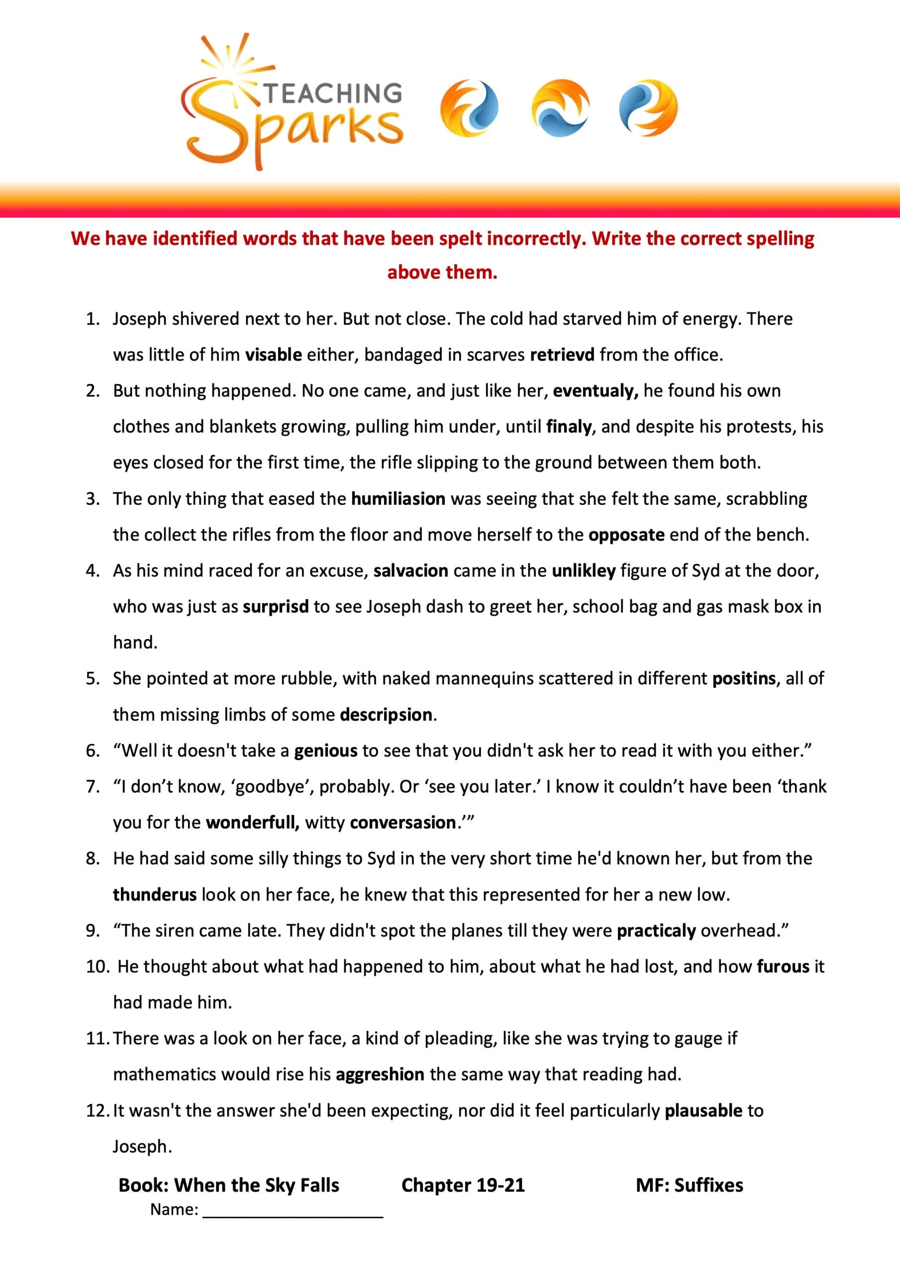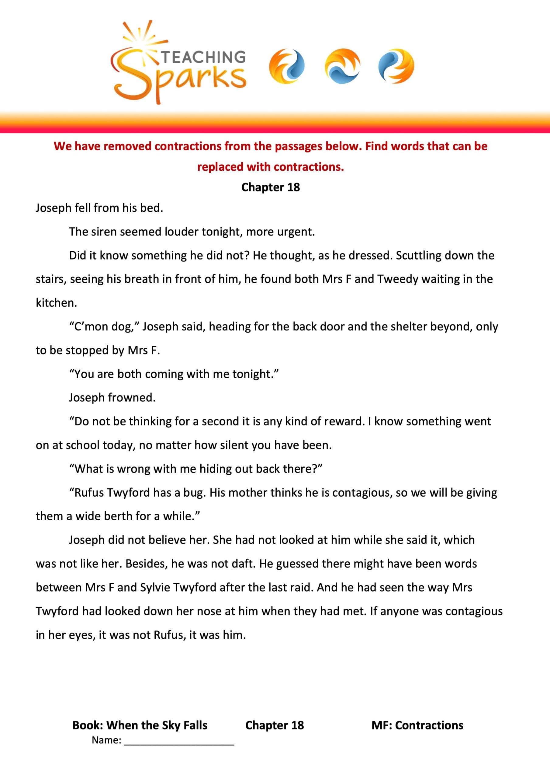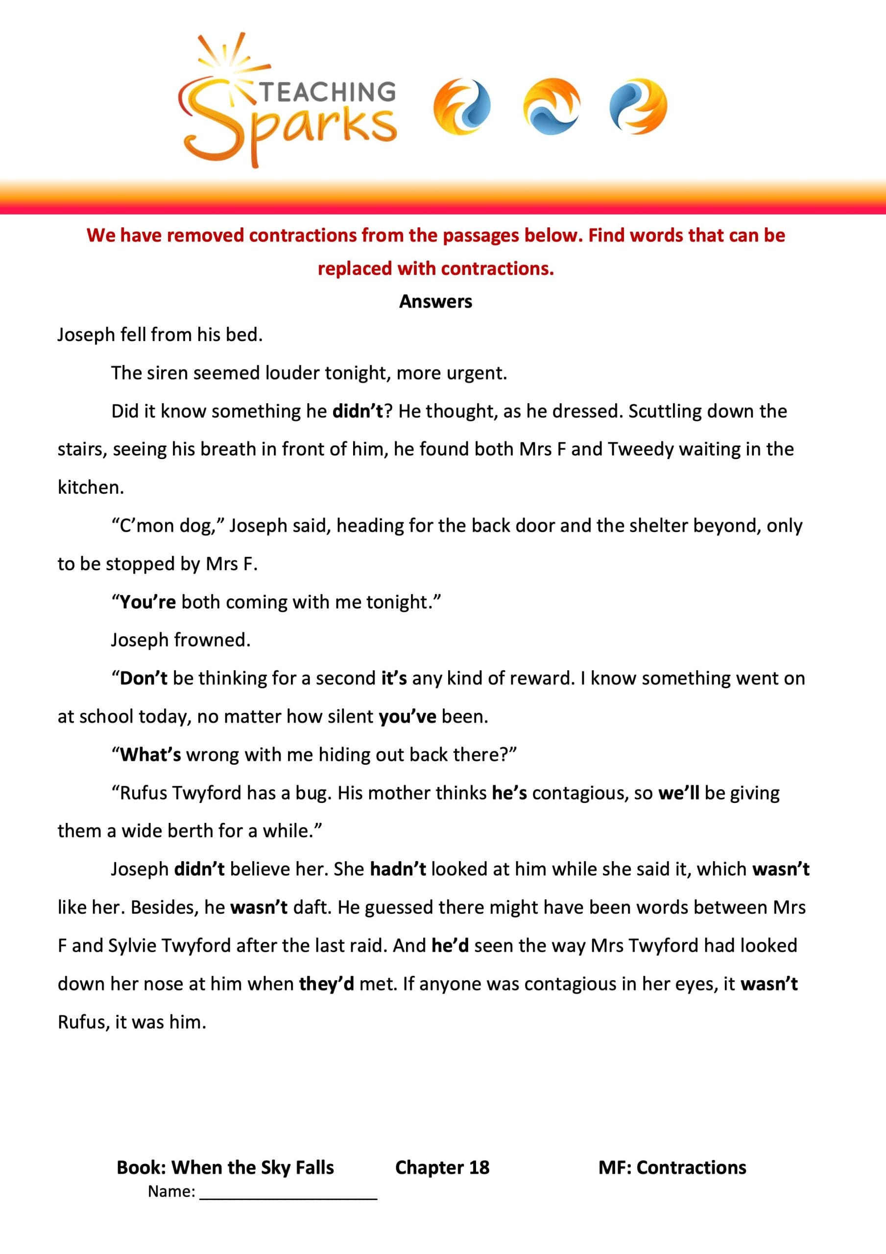 This teaching resource is linked to Chapter 18 of When the Sky Falls and focuses on contractions, developing editing and punctuation skills.